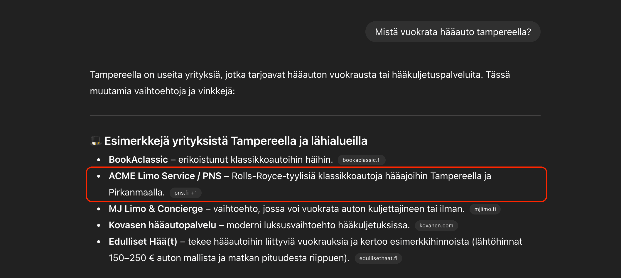 Google nostaa säännöllisesti PNS:lle listautuneita yrityksiä mukaan AI-yhteenvetoihin. Näin tekee myös muut teköälyt ja kielimallit.